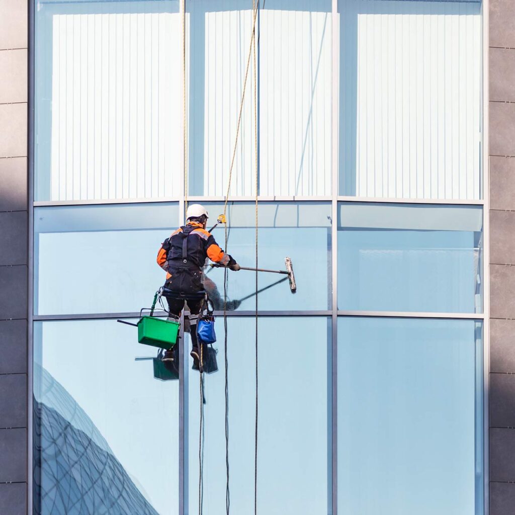 Pulizia di vetrate e finestre esterne in edifici alti o con accesso difficile, eseguita da personale specializzato e attrezzato per operare in sicurezza.