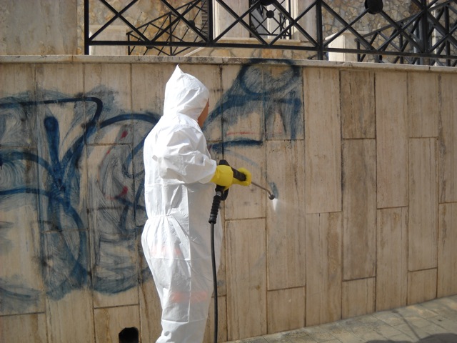 Ripristino delle superfici danneggiate da scritte e graffiti su facciate, saracinesche e pareti esterne, con tecniche non invasive.